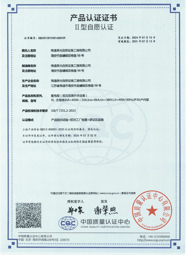 低壓抽出式開關(guān)柜認(rèn)證證書