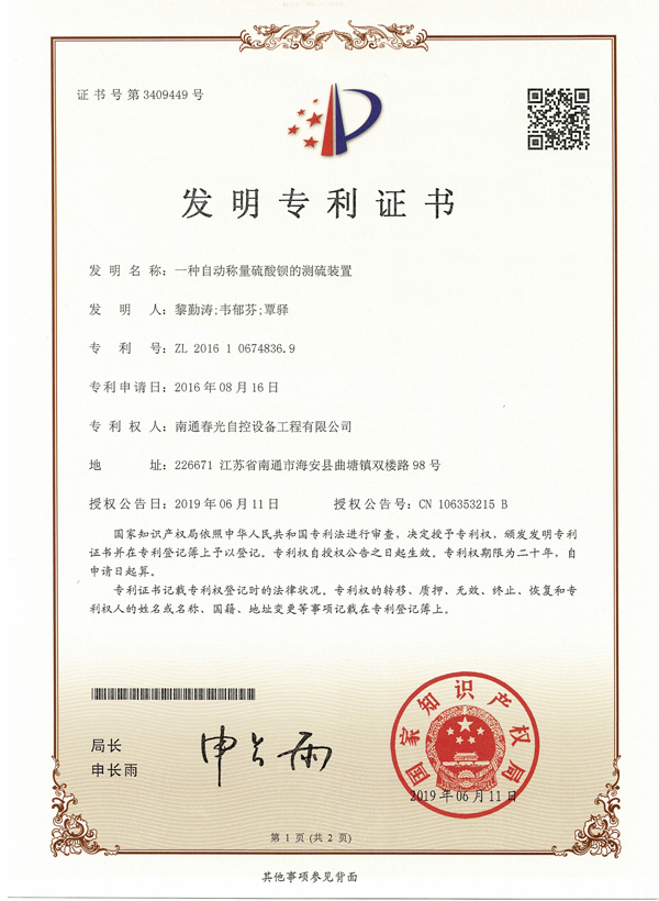 一種自動(dòng)稱量硫酸鋇的測(cè)硫裝置專利證書